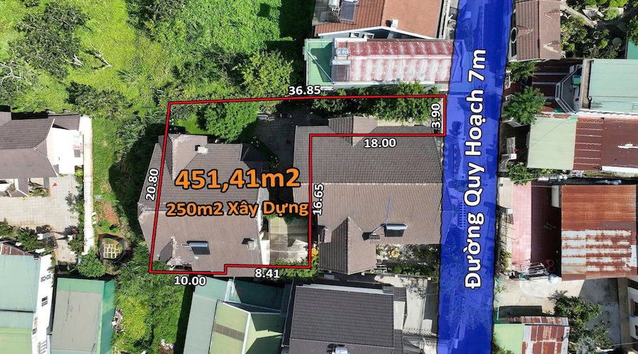 - Diện tích: 451m², trong đó có 250m² là đất thổ cư và 201m² đất nông nghiệp, tạo nên một khuôn viên rộng rãi và thoáng đãng. Mặt tiền rộng 20m mang đến không gian mở và thoải mái cho ngôi nhà.